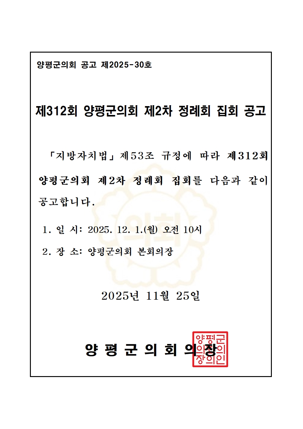 1. 일 시: 2025. 12. 1.(월) 오전 10시 2. 장 소: 양평군의회 본회의장 2025년 11월 25일 양평군의회의장 |